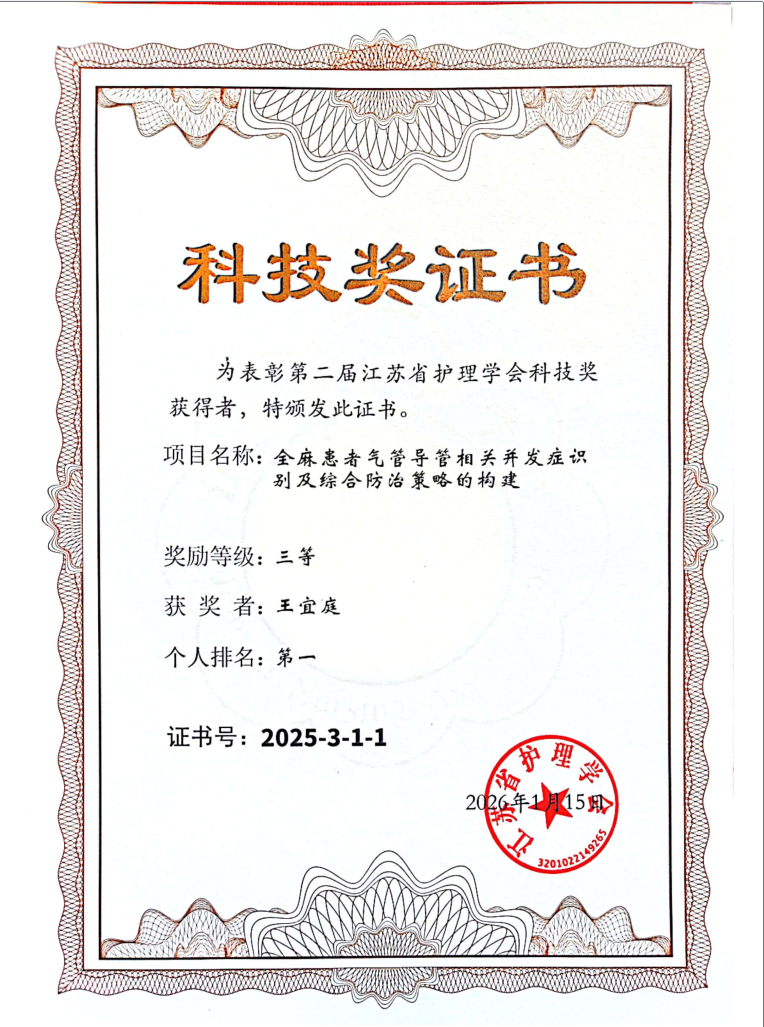 我院科研项目荣获“江苏省护理学会科技奖”三等奖
